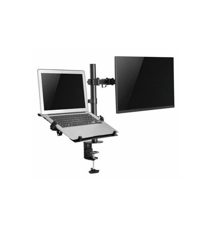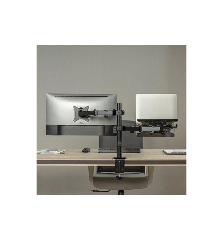 Diseño ergonómico 2 en 1: soporta un monitor y un portátil al mismo tiempo, permitiendo alinear ambos a la altura ideal para tu vista.